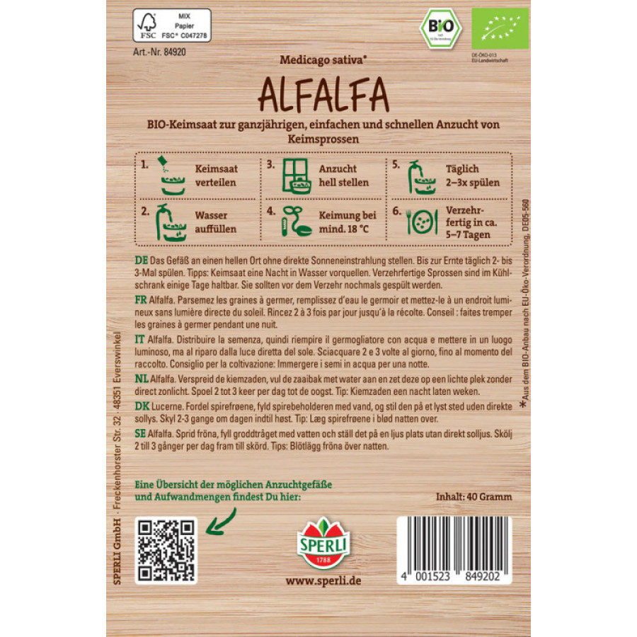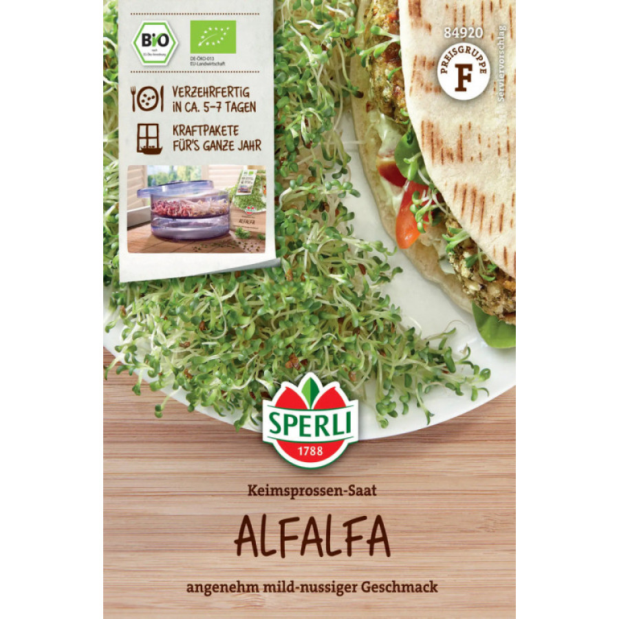Luomu alfalfan (sinimailanen) siemen idätykseen. Itämisaika 5-6 päivää.