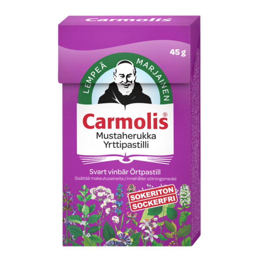 Pehmeissä sokerittomissa pastilleissa maistuu mustaherukka ja vanhan luostarireseptin mukaan valmistettu Carmolis-öljy.